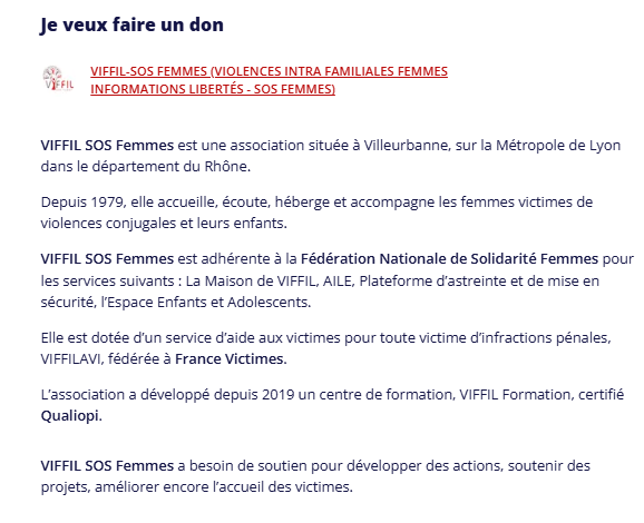 VIFFIL est une association qui vient en aide aux femmes victimes de violences conjugales. Depuis 1979, cette structure prend en charge les femmes et leurs enfants en les hébergeant, en les accompagnant et en les soutenant. Parce qu’une femme ou un enfant n’est jamais responsable des violences qu’elle subit, VIFFIL met tout en œuvre pour aider les victimes.